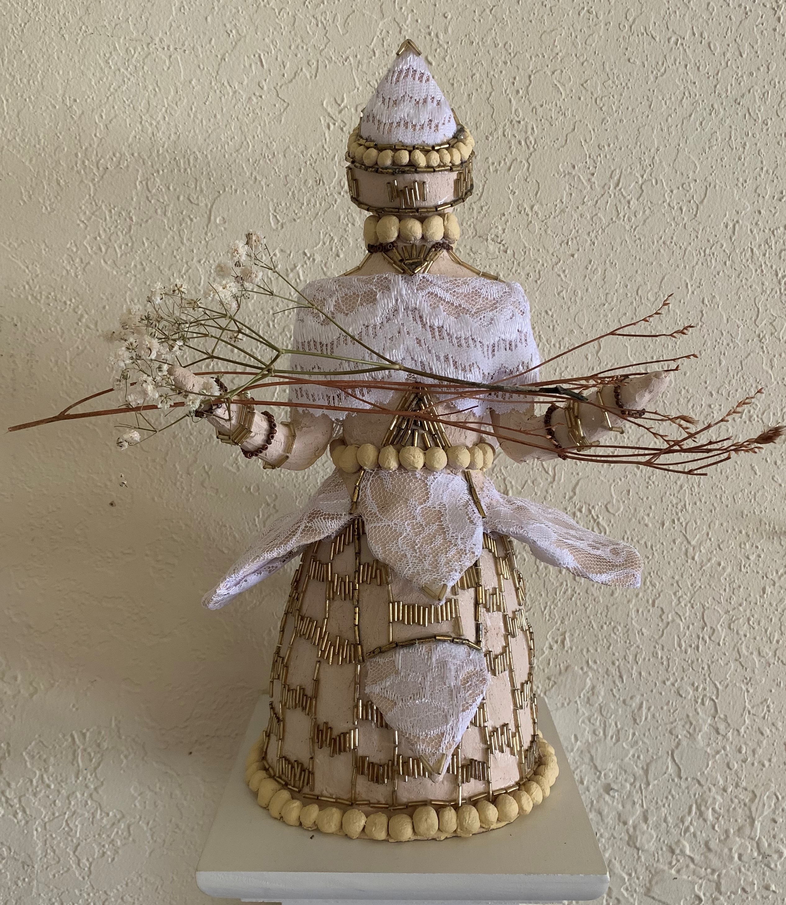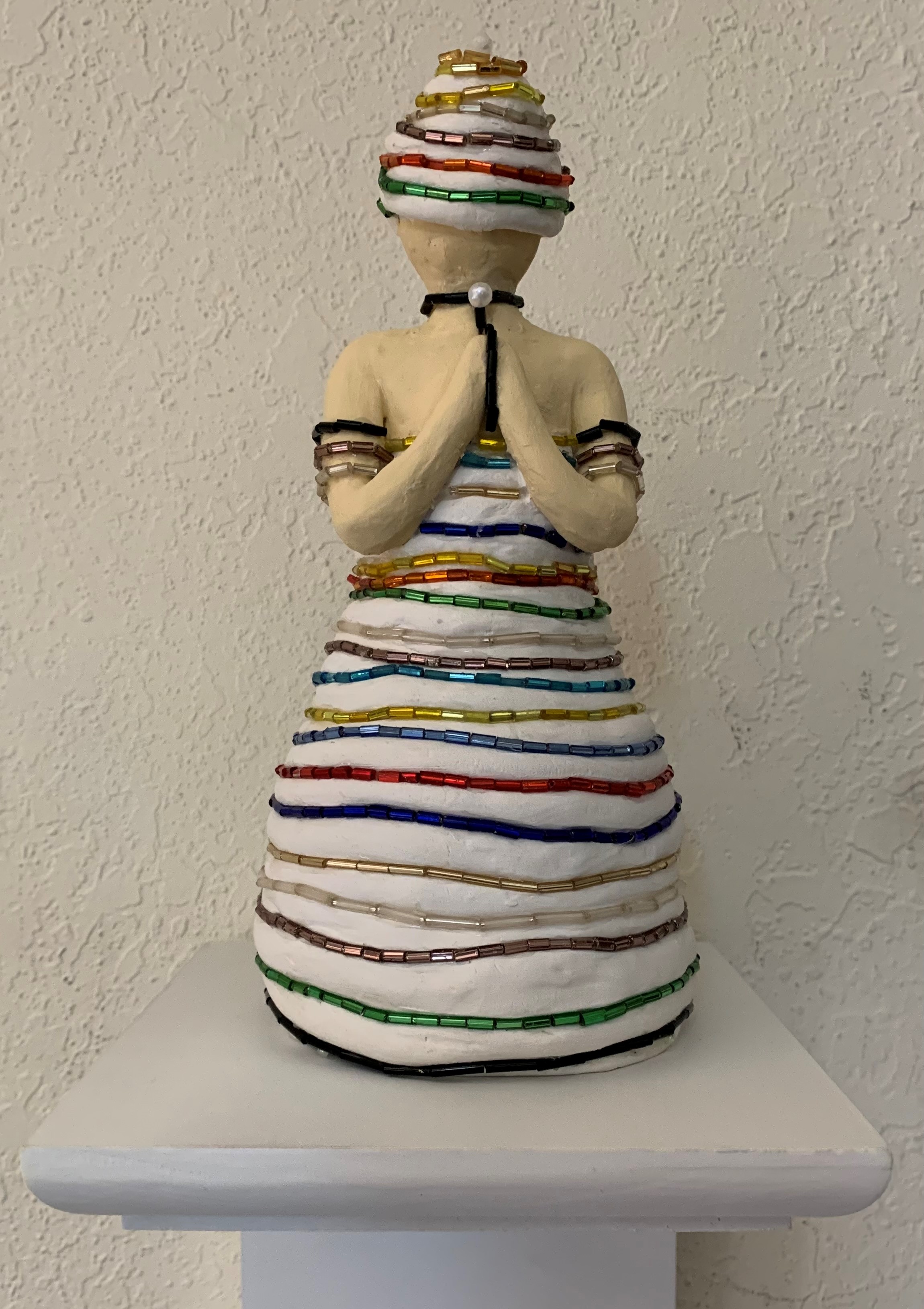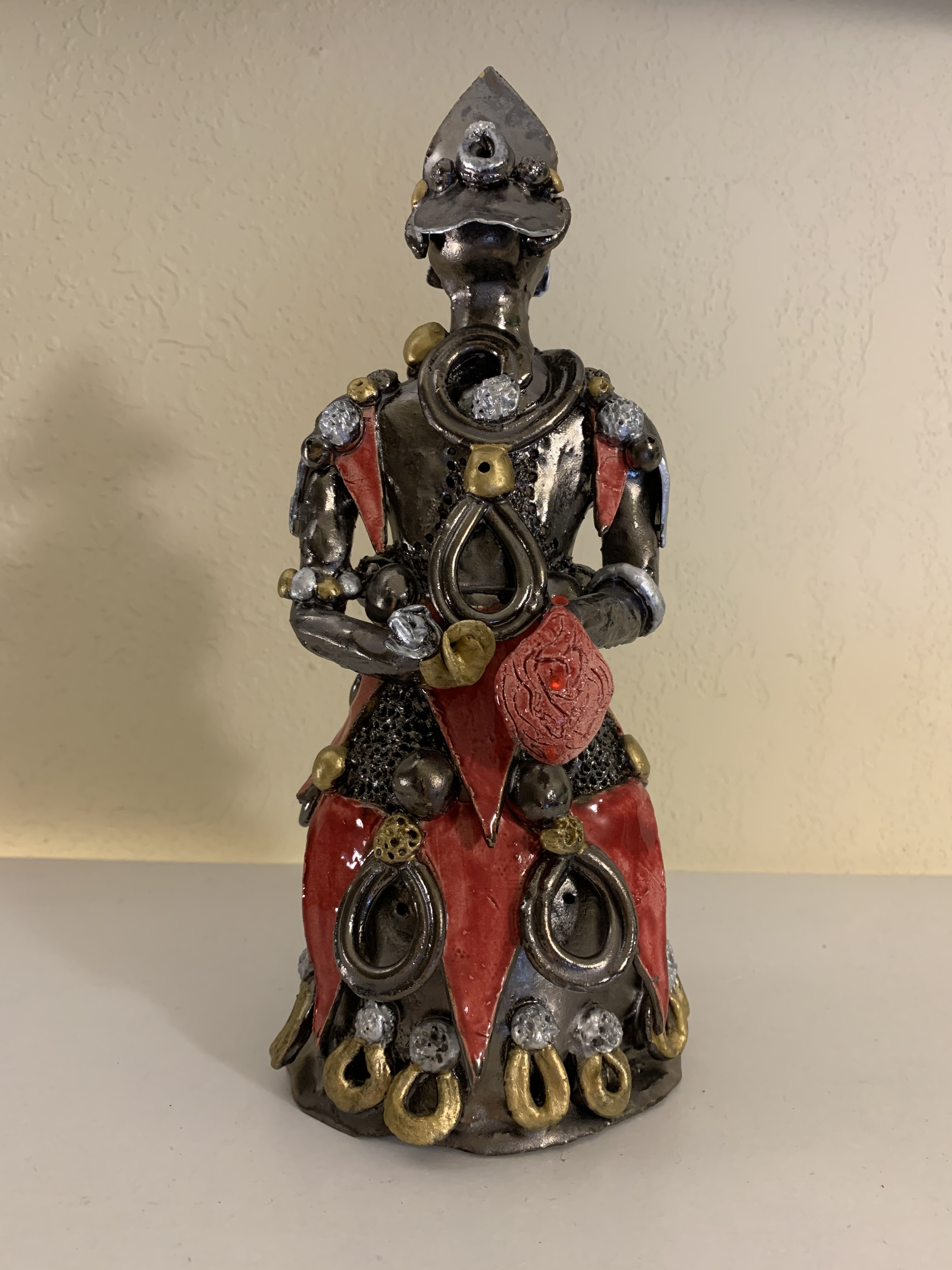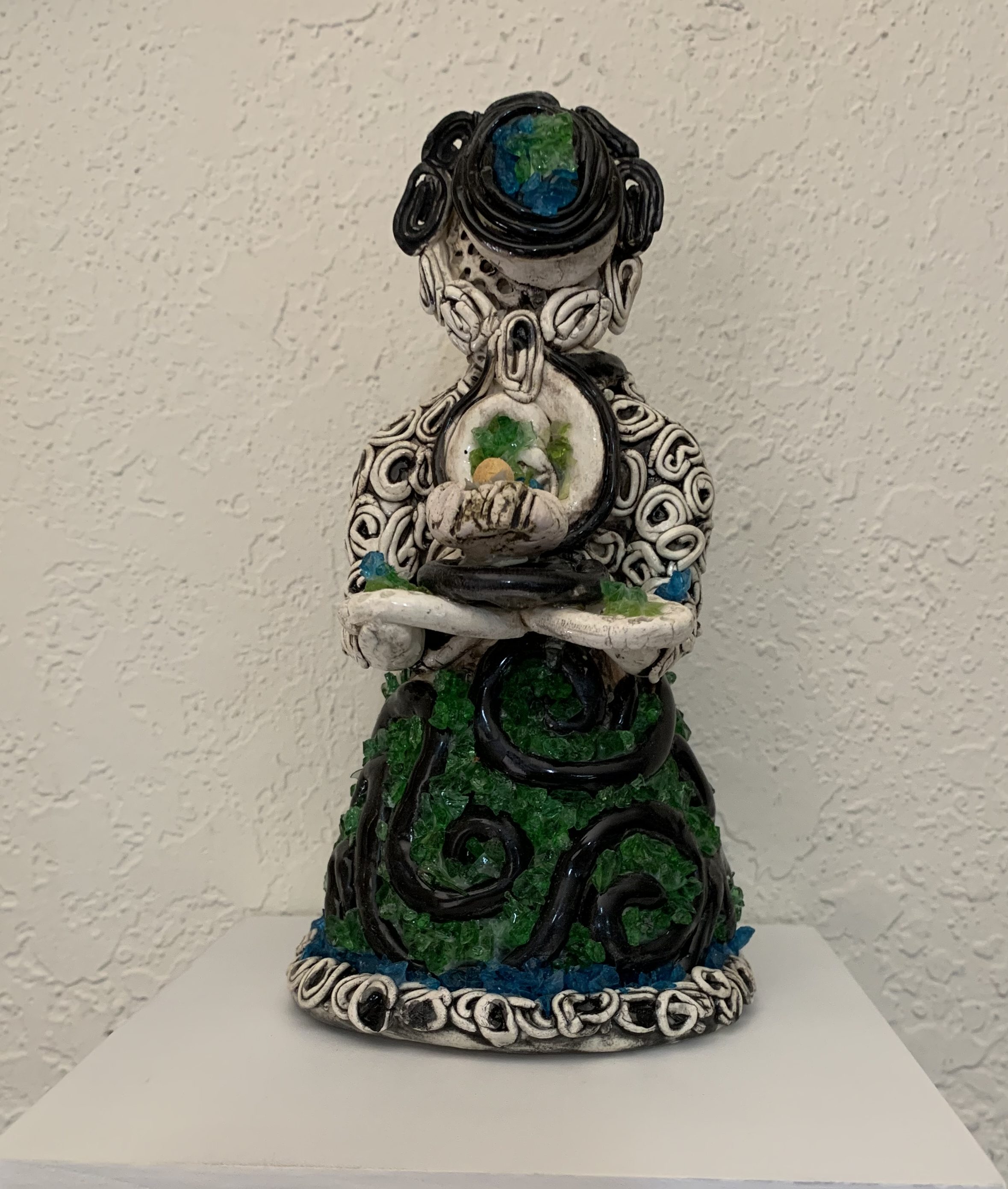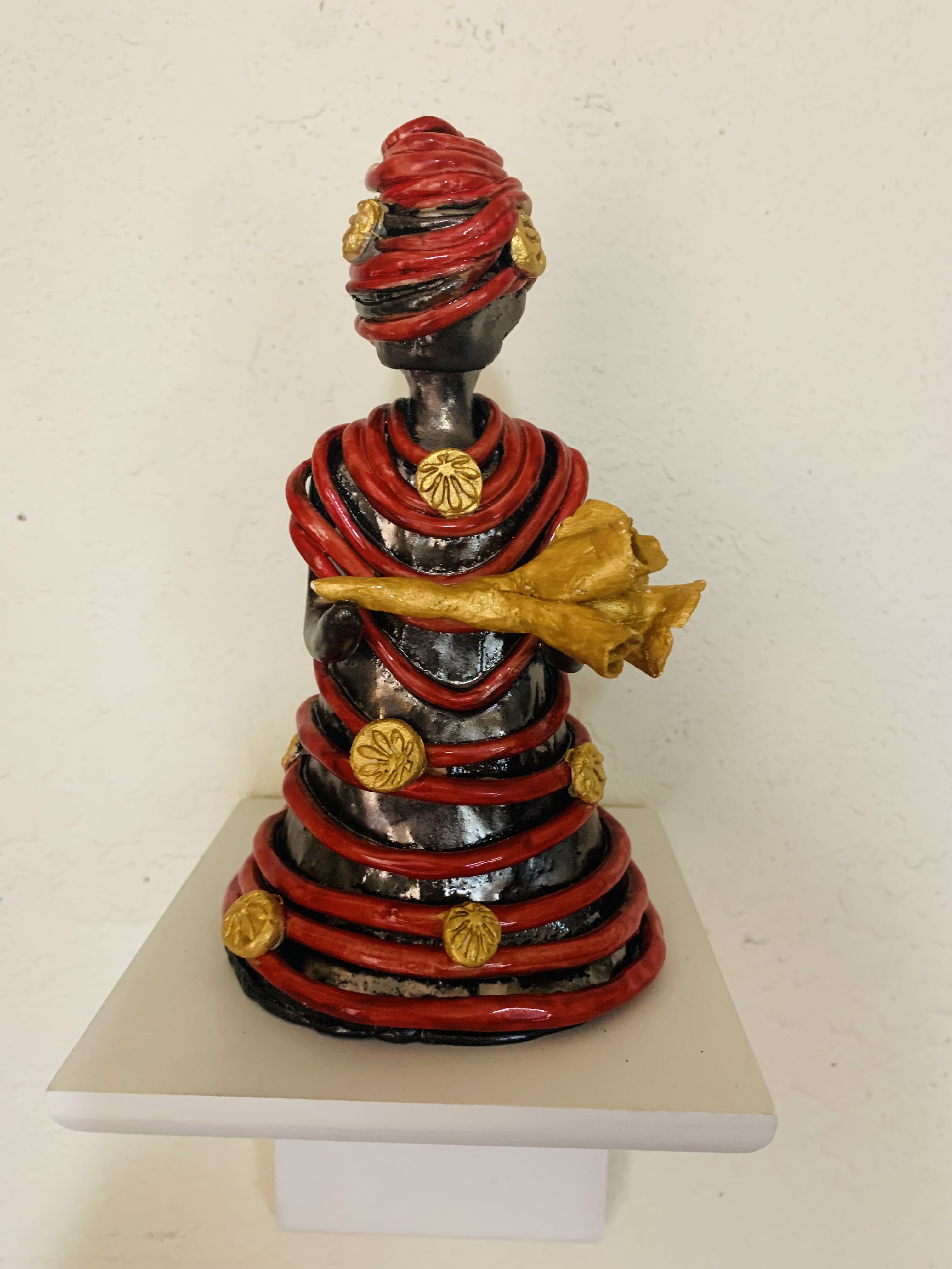I’m fascinated by the relationship between human beings and the powerful, yet mortal spirits of the Orixas (Orishas). The Orixas are spirits that help enable human begins achieve the destiny that God planned for them before they were born. They are part of the African religion from the Yoruba nation that came to my home city during the slave trade. To be cohesive with my style of creation, I fuse my inspirations in these small figures by adding textures, blended colors, swirled lines, and intrinsic shapes from the ocean, other natural elements, and African symbolism. I call them Guardians. They offer peace and are intended to guard nature and ourselves.